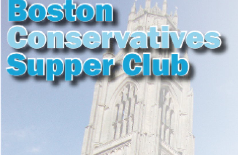 Venue: The Boston & County Club, Parkgate, Boston PE21 6RL Guest speaker: Peter Bone MP Menu: Steak and Ale Pie and Lemon Cheesecake Tickets: £10 per person Cheques payable to: "Boston Conservatives Supper Club" Send to 13 Somersby Green, Boston PE21 9PH. More details: Dudley Bryant - 01205-364017 [email protected]